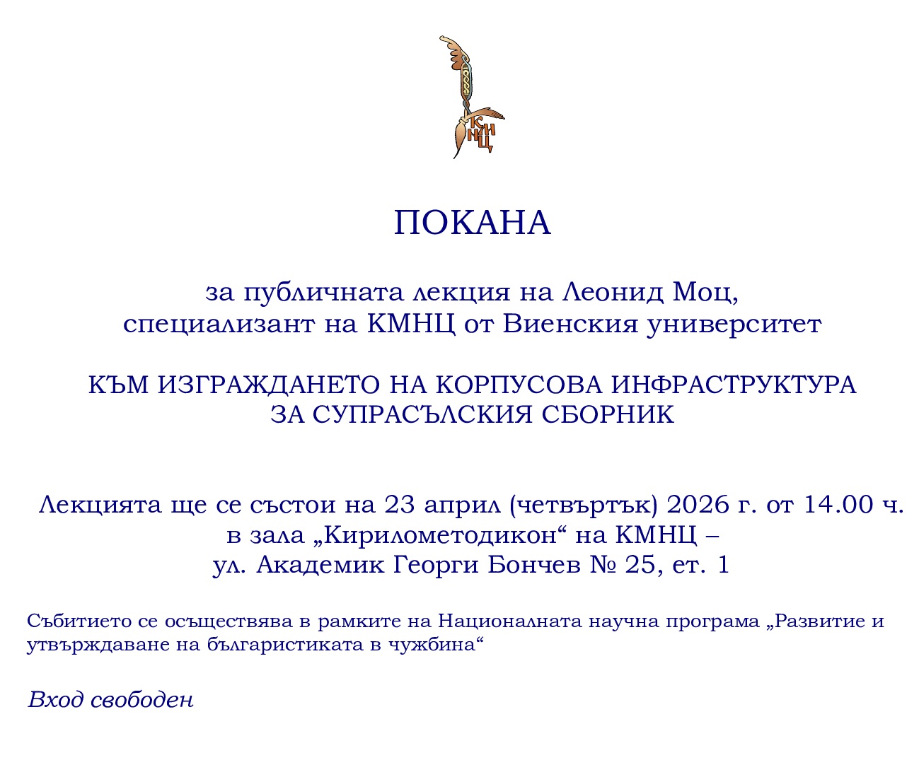 Лекцията ще се фокусира върху текущия специализационен проект на Леонид Моц в КМНЦ, който има три цели: 1. Разработване на методология, позволяваща (полу-)автоматичното анотиране на типа на номиналната основа и процесите на морфологична аналогия в Супр, 2. изграждане на инфраструктура на корпуса с подходящи филтри за търсене, преглед на конкорданси и визуализации, и 3. описание на пълната динамика на аналогията на основите в Супр. Ще бъдат разгледани възможностите и предизвикателствата, свързани с използването на големи езикови модели (т.н. Изкуствен интелект) при осъществяването на това изследване, наред с представянето на предварителните резултати.За Супрасълския сборник (Супр) – един от най-важните паметници на старобългарския език и ценен източник за неговата историческа граматика – все още няма достъпна дигитална корпусова ифраструктура, включваща не само дипломатическо издание на текста, но и морфологическа анотация, възможност за търсене на форми и др.