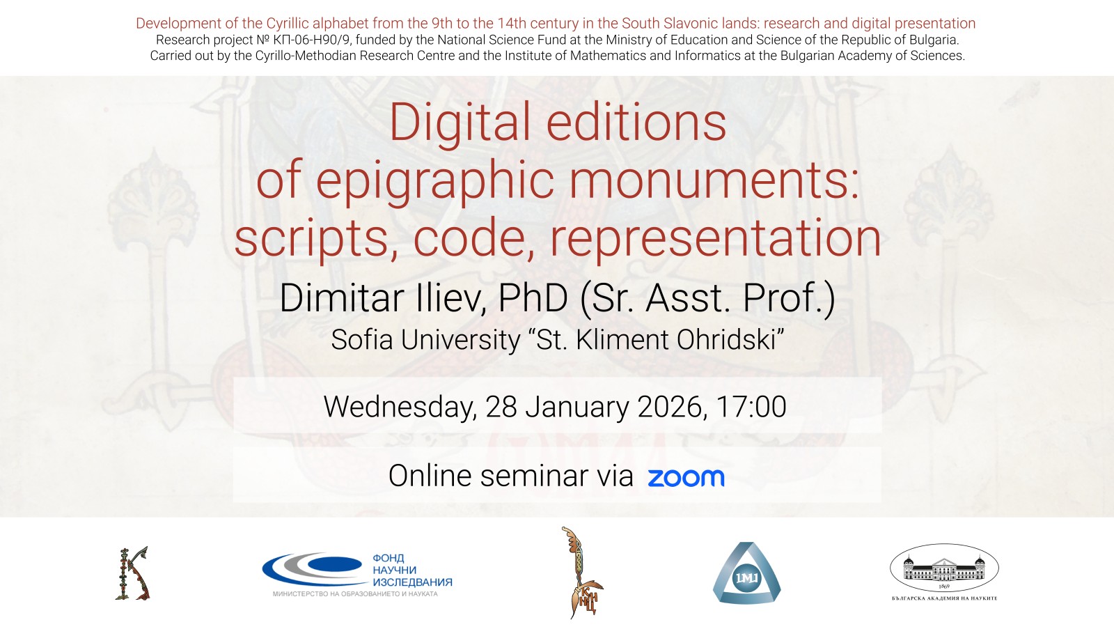 Третият онлайн семинар, организиран в рамките на проект „Развитие на кирилицата в южнославянските земи от IX до XIV век: изследване и цифрово представяне“, ще изследва епиграфския материал като ключов етап в развитието и формирането на графичната система на кирилицата, която по-късно намира своя завършен израз в ръкописната традиция.